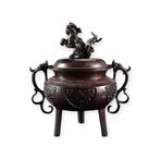 - Gegoten bronzen driepootwierookbrander met shishi (leeuw)Een zwaar cast bronzen driepoot kro met een shishi–knop op de deksel, gesigneerd en daterend uit de shwa-periode of eerder, uit japan afkomstige, circa 1,355 kg en circa 10,2 × 15 × 16 cm, in uitsteke