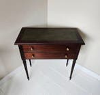 HierPub au topCatawikiToute la Belgique - Bureau à caissons - Bois, Cuir, LaitonBureau élégant de style anglais du milieu du xxe siècle (1960–1970), en bois avec plateau en cuir incrusté et détails en laiton, origine europe, dimensions 73 cm de largeur, 73,5 cm de hauteur et 37 c