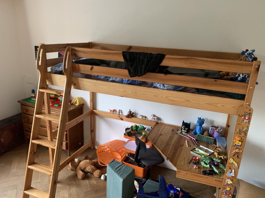 HierKoenBeringen - lit enfant en hauteurLit enfant - 1 place - en bois. Avec échelle de 5 marches la hauteur total = 1.80 M le matelas est à 1.40 M du sol largeur = 1 m longueur = 2 m sommier en lattes de bois épaisses. Espace bureau sous lUtilisé Enlèvement