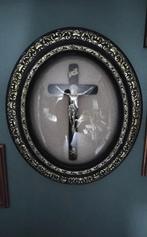 14 mars 26twinkeltjeKasterleeBeau cadre photo ovale antique avec verre sphérique et croixEnlèvement ou EnvoiKasterlee14 mars 26 - Antiquités et objets d'art | Objets religieuxCrucifix ancien encadré sous verre convexe ovale soufflé à la main. Le cadre est noir avec un bord intérieur légèrement doré et contient un « passe partout » (probablement du placoplâtre ?) , Orné de