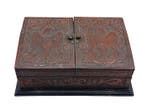 17 févr. 26Christine RadsonAnderlecht - Caisse - Reliefs néogothiques des aigles - Bois - DoubleLa boîte en bois neogothique relieves águilas d’espagne, datée 1940–1950, dimensions 24 cm de largeur, 17 cm de profondeur et 10 cm de hauteur, en bon état d’usage avec signes mineurs, avec double ouv