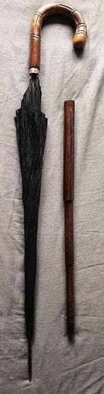 28 mars 26BilounissssUccle - Canne de marche - Métal blanc, Bambou, Bois doré - CanneCanne parapluie de gentleman datant des années 1930–1940, avec une poignée courbe en bois sculpté façon bambou, un long fût en bois, une toile noire et des ferrures métalliques blanches, dimensions 91