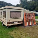 Avant-hierPatrick circus malterMoerbeke - Caravane pliante Esterel Top volume 39 C.D.N.Equipée d'un auvent et d'une solette et comprenant 4 couchages, chauffage d'origine, frigo, bloc cuisine. Pneus neufs.la masse en ordre de marche est de 775 kg, masse maxi autorisée : 9001998 Enlèvement