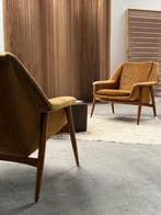 9 avr. 26GianfrancoHalle - Cassina - Wilhelm Knoll - Fauteuil (2) - 854 - Fluweel,Twee middeleeuwse loungestoelen, model 854, door wilhelm knoll voor cassina, met teakhouten frame en goudkleurige koord-samt bekleding, gedateerd op 1950–1960, afmetingen 68 × 80 × 70 cm (breedte × di