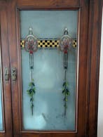 17 août 25Marcel1915Poperinge - Crédence - Verre, Laiton, CerisierBuffet à deux corps italien du style liberty (art nouveau), daté circa 1900–1920, réalisé en bois de cerisier avec portes en verre ornées de motifs originaux de l’époque, doré au bronze, couleur marro
