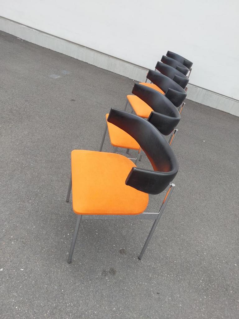 26 mars 26william11Mortsel - Lot de 6 chaises Vintage - Italie- années 60Assise en tissu orange et dossier en skaï noir excellent état a retirer sur kraainem ou wavre livraison possible par nos soinsEnlèvement