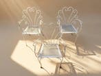 - Chaise - Fer forgé, Métal - Trois chaises de jardin blanchesTrois chaises de jardin blanches avec cadre en fer forgé de style provençal, fabriquées en espagne, datant des années 1940–1950, en état moyen avec un usage important et possiblement des pièces manqua