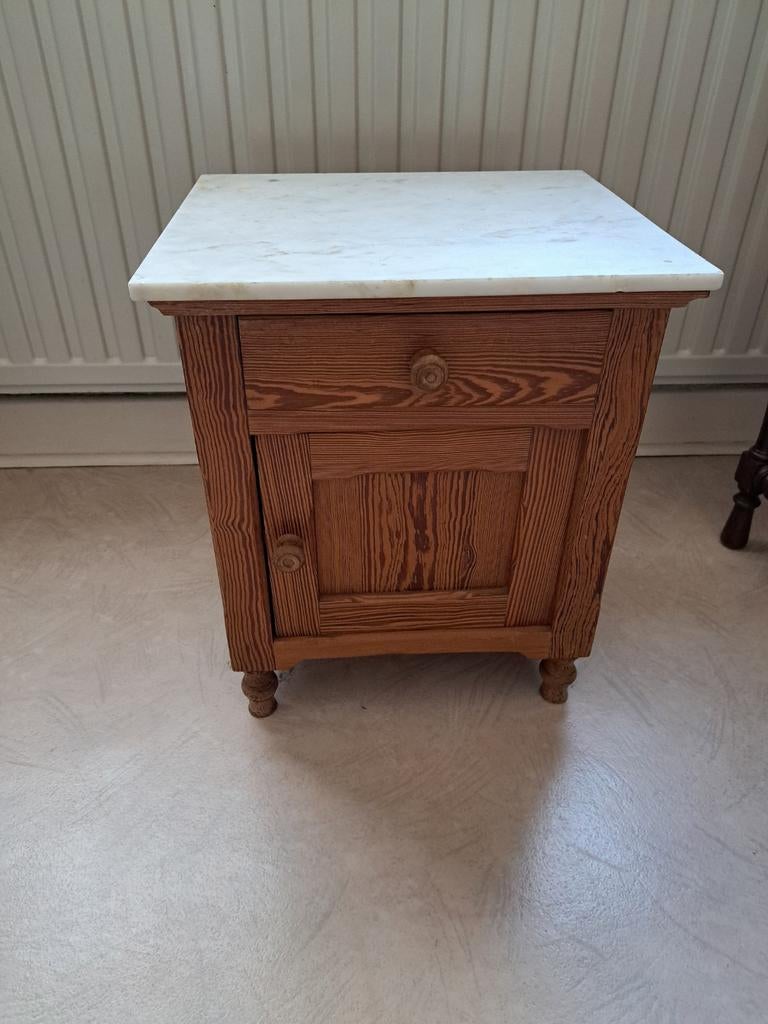 15 avr. 26ElsIzegem - Table de nuit en pichpin années 40Ancienne table de chevet. Marbre juste posé. Un petit trou visible photo 3.Enlèvement