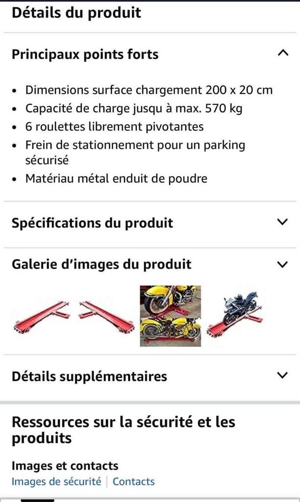 3 avr. 26LaurenceMons - Chariot roulant de déplacement et stationnement pour motoChariot roulant de déplacement et stationnement pour moto. Marque - wiltec couleur - rouge style - 250 kg finition extérieure - antidérapant type de poignée - levier attention --> ne convient pas pComme neuf Enlèvement ou Envoi