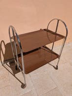 10 mars 26CSStavelot - Chariot de service - Pliante - Chrome, formica - Desserte àDesserte à roulettes pliante en chrome et formica, fabriquée en france, bon état avec quelques usures et traces dues à l’âge, dimensions 80 x 60 x 40 cm, style vintage, période 1970–1980, couleur brun