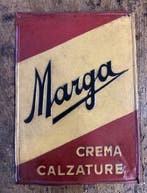 HiercambierBinche - Targa Marga Crème Chaussures - Enseigne publicitaire - MétalMarque: marga crema calzature; matériau: métal; origine: italie; état: original/officiel en bon état d’usage avec de légères traces d’âge et des taches; dimensions 35 cm sur 25 cm.