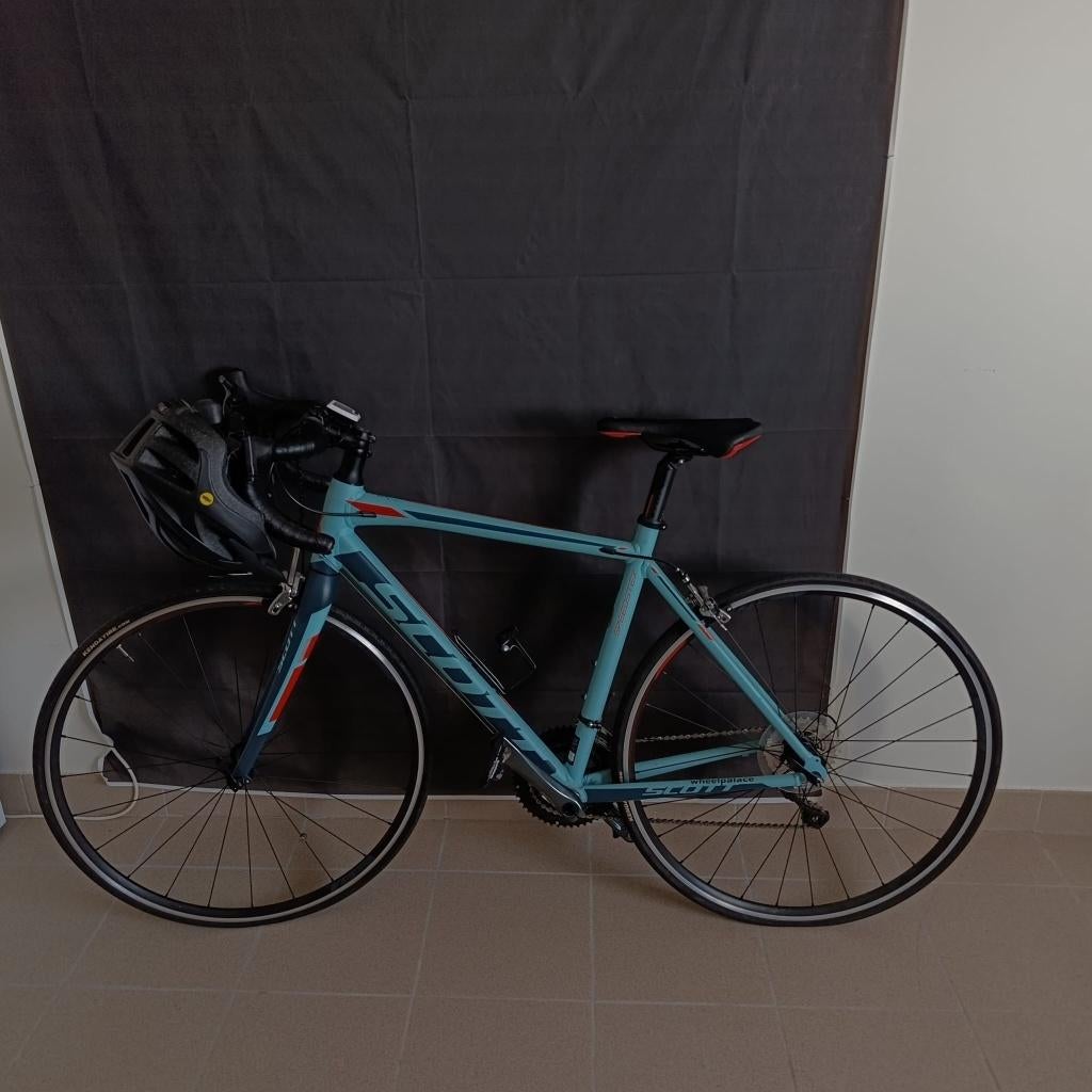 - vélo de route pour femmesVélo de route scott speedster avec cadre en aluminium. Les pédales de vélo conviennent aussi bien aux chaussures classiques qu'aux pédales à clic. Casque de vélo inclus. La personne qui a fait duComme neuf Enlèvement