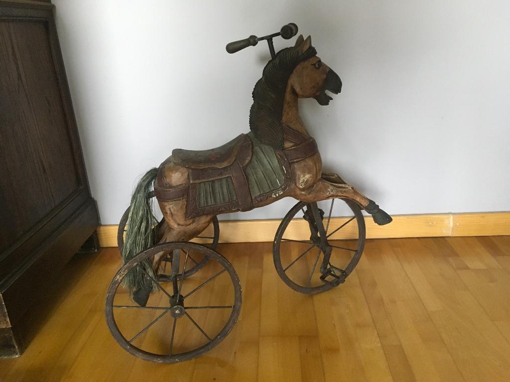 26 mars 26Occasion-neufFleron - cheval en bois sur roues avec pédalesCheval en bois, à roulettes et à pédales, à des fins décoratives ainsi que pour les jouets. Parfait état. Année d'achat : 1974 hauteur jusqu'au volant 60 cm, largeur 65 cm enlèvement près de bEnlèvement