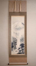 23 mars 26AxeCharleroi - Mont Fuji enneigé - Chutes deau et paysage de ruisseau -Hors-d’œuvre de papier peint à la main original, par takahasi shin (né en 1940), signé, période shwa, représentant le mont fuji avec une cascade et une vallée; dimensions totales 193,7 × 54,7 cm avec