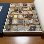 Aujourd'huilies®Dendermonde - Collection déchantillons de minéraux et de roches (36Set éducatif de l’époque showa, japon : une collection de 36 minéraux et roches bruts exposés dans des compartiments individuels avec une fiche de référence japonaise, origine japon, avec une étiquett
