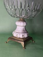 4 avr. 26ErikGenk - Plateau - Porcelaine, Cristal - Art nouveauCentre de table antique en porcelaine et cristal taillé, circa 1950–1960, avec un bol en verre dépoli sur une colonne en porcelaine blanche à accents dorés et une base en métal ornée, origine france,