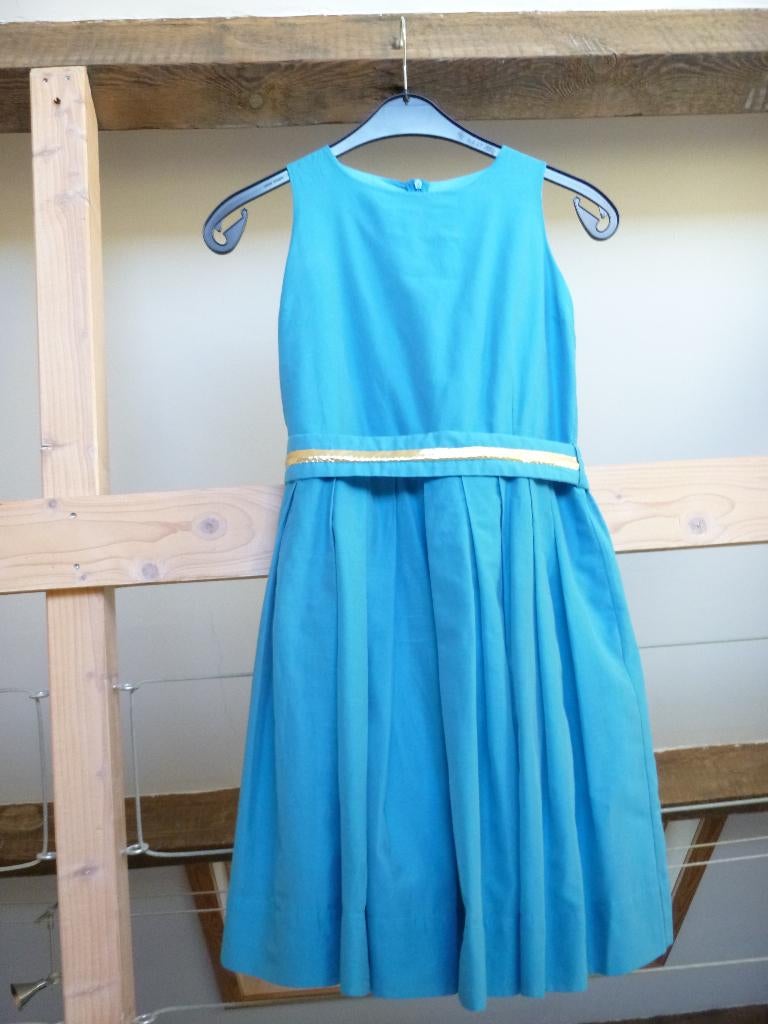 - Turquoise communie- of lentefeestkleed Rtb +tas (maat 13j)Mouwloos, turquoise-kleurige feestjurk van het italiaanse merk rtb. Op de ceintuur werd een goudkleurig lint aangebracht omdat dit beter samenging met het pulletje en de schoenen van mijn dochter. DitNeuf Enlèvement ou Envoi