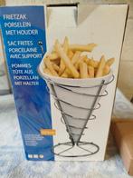 13 oct. 23LoForest - CuisinePrésentoir de service représentant un cornet de frites, en céramique blanche, sur un support métallique, dans sa boîte d'origine.