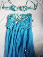 - Costume danse orientaleCostume en tissu velours orangé, jupe droite, fendue, élastiquée et broderie dorée. Le haut se noue dans le dos et le cou. Ceinture bleue et grand voile rectangulaire assorti + un voile plus petit. EtComme neuf Enlèvement ou Envoi