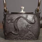 Aujourd'huiAnnonce au topZORROLokeren+Deel Overmere En Zele - southern iron kettle - Théière - Laiton moulé, Fonte -Une bouilloire en fonte japonaise au corps carré et reliefs reliefant des papillons et des motifs à rubans, une poignée en branche de cuivre incurvée ornée d’un motif fleur de prunier, un couvercle en