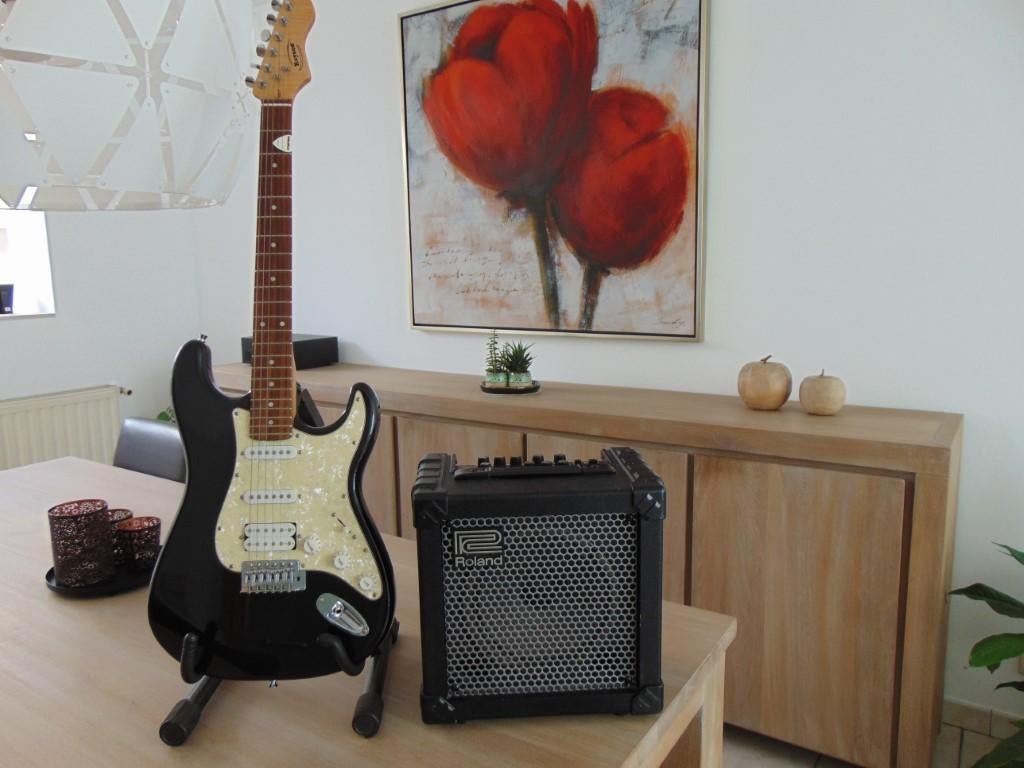 Aujourd'huifazerMenen - Gitaar stratocaster SX + Roland Cube 15XL versterker .Gitaar stratocaster sx + roland cube 15xl versterker . Gitaar is splinternieuw !! 3 Single coils . 1 Volume en 2 tone regelaars . 5 Standen schakelaar . Tremolo stang . Gitaarversterker roland cube 15Neuf Enlèvement