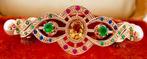 Antiek art nouveau armband uit 1910–1915 in 9 kt roségoud en zilver, met een centraal 1,50 ct citrien, 16 smaragden samen 0,70 ct, 8 robijnen zoals 0,12 ct, 6 saffieren samen 0,06 ct en 16 cultuurpare