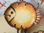 - Quimper - Paul Fouillen - Bord (8) - Polychrome zandsteenPrachtige reeks van 8 decoratieve borden in visvorm, gesigneerd paul fouillen. Geglazuurd steengoed met polychrome tinten met gevlekte bruin, groen en geel, met een stralend motief dat een zon oproept