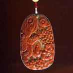Unieke rode edelsteen amulet, met handgesneden 20eeeuwse stijl uit natuurlijke rode agaat met zilveren bail, afgebeeld phoenix, zittende boeddha, dharmawiel en pioenrozen, 9×5,5 cm, in uitstekende, or