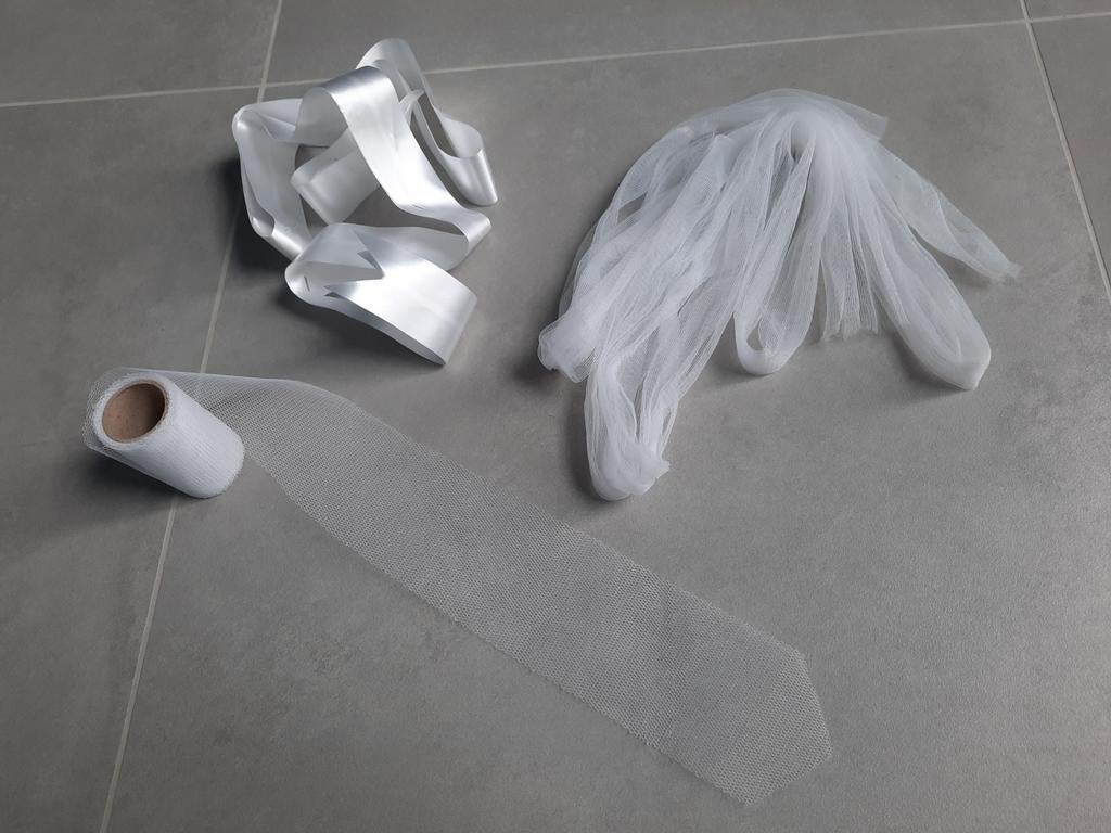 - Décoration de voiture de mariageDécoration de voiture de mariage composée de : - 1 nœud papillon d'environ 15 cm de diamètre pour la cape - 1 rouleau de 320 cm pour fixer le nœud à la voiture - 2 rubans de 180 cm pour les miroirComme neuf Enlèvement ou Envoi