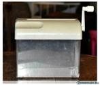 - petit destructeur de document manuelPetit destructeur de document manuel en matière plastique un fêle dans le bac plastique qui n'entrave pas son utilisation dimension 17x18x11 cm vendu en état visible sur la photo d c56 etat: utili