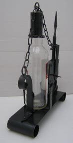 - Hangslot - Flessen-slotZeldzame fleskluis met ketting van smeedijzer, daterend uit 1940–1950, afmetingen 39 cm hoog, 33 cm breed, 10 cm diep en gewicht 2,4 kg, afkomstig uit frankrijk. Flessenhouder met ketting en slotafmet