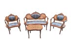Aujourd'huiPub au topCatawikiToute la Belgique - Sofa (4) - Hout, TextielVintage italiaans woonkamerset van gegraveerd hout uit 1900–1910, met blauw bekledingstof met verticale bloemen en tafelblad van vienna stro, bestaande uit divan, twee stoelen en een bijpassende salon