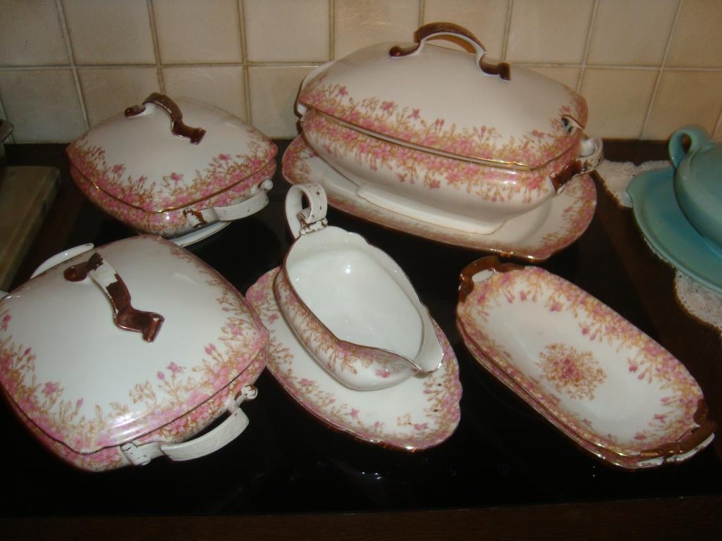 17 nov. 22R.Mechelen-Aan-De-Maas - Eetservies in Limogesporselein.2 terrines, 3 raviers, slakom, fruitschaal, sauskom, ovale schotel, 12 dessertborden, 10 platte borden, 4 diepe borden.Enlèvement