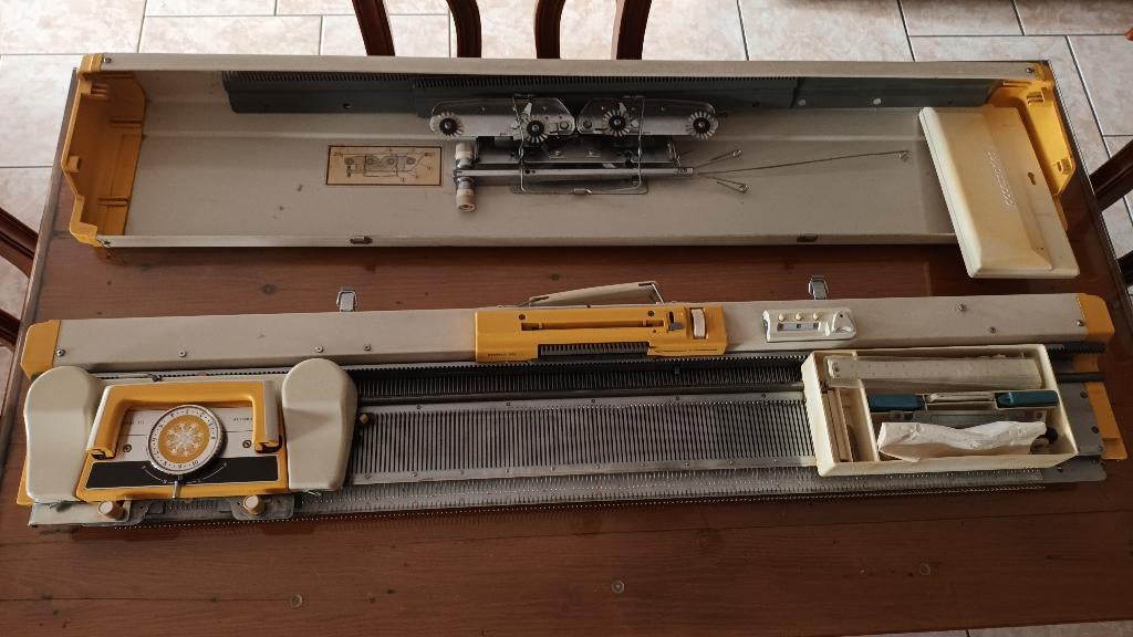 - Machine à tricoter Empisal-KnitmasterUne vieille machine à tricoter double lit d'occasion avec divers manuels et accessoiresUtilisé Enlèvement