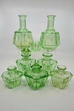 - Art déco Ensemble de toilette (8) - OuralineEnsemble art déco en verre uranium vert, huit pièces, fabriqué en europe, état moyen avec bouchons manquants, plusieurs éclats et une bouteille de parfum cassée.
