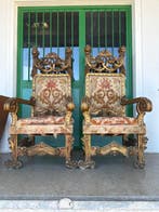 29 mars 26Pub au topCatawikiToute la Belgique - Fauteuil (2) - Velours, Bois doréDeux trônes antiques d’italie, du xixe siècle, style baroque, garnis de velours et bois doré, en état usé avec probablement de petites pièces manquantes.