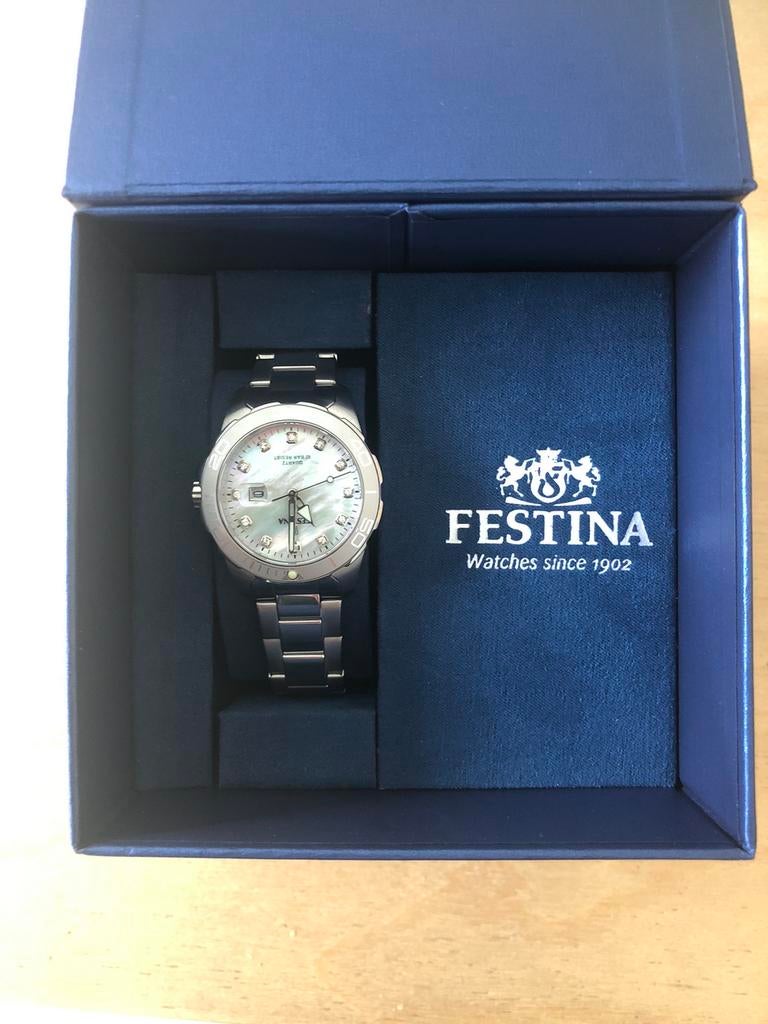 - Festina f20503 NieuwNieuwe dameshorloge in originele verpakking. Nieuwprijs 130 euro, vraagprijs 75 euro. Diameter 35mm, roestvrij staal. Zilvergrijs. Binnenwerk quartz. 3 Wijzers, datum en verdraaibare buitenring. ElegaNeuf Enlèvement ou Envoi