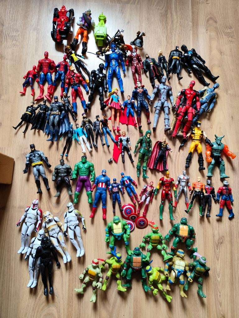 HierPub au topCatawikiToute la Belgique - Lot de figurinesLot figurines entre autres spiderman, tortues ninja, star wars, superman, batman, avengers, etc. Ces personnages ont déjà vécus beaucoup d'aventures d'où le prix...Utilisé Enlèvement ou Envoi