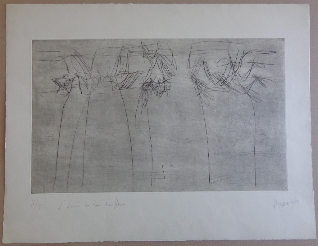 27 août 25Pub au topBoekenBalieToute la Belgique - JEAN MESSAGIER / LYRISCHE ABSTRATIE / ZW-W ETS / 50x66cm SIGJean messagier (1920-1999). Lyrische abstractie/abstraction lyrique. Titel/titre: "l'arrivée au bord d'une fleuve". Zwart-wit ets op papier/eau-forte noir-blanc sur papier. GesigneerEnvoi