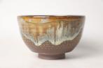 - Bol à thé Chikuzen Takatori-yaki avec décoration émailléeTasse à thé takatori-yaki originale du four housen, japon, en bon état, céramique avec glaçure extérieure ambre-brun et coulures bleu-blanc, motif orange de points sur un fond brun foncé, intérieur no