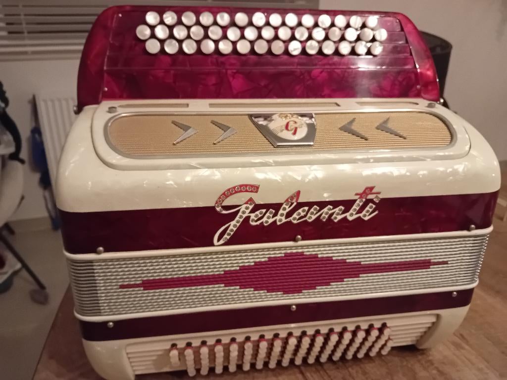 - Knopaccordeon Galanti 96 bassenPrachtige accordeon van het merk galanti, speelklaar de accordeon speelt nog zuiver accordeon in c-systeem, 96 bassen, schouderriemen inbegrepen, speelt in octaafstemming en heeft tremoloregisterUtilisé Enlèvement