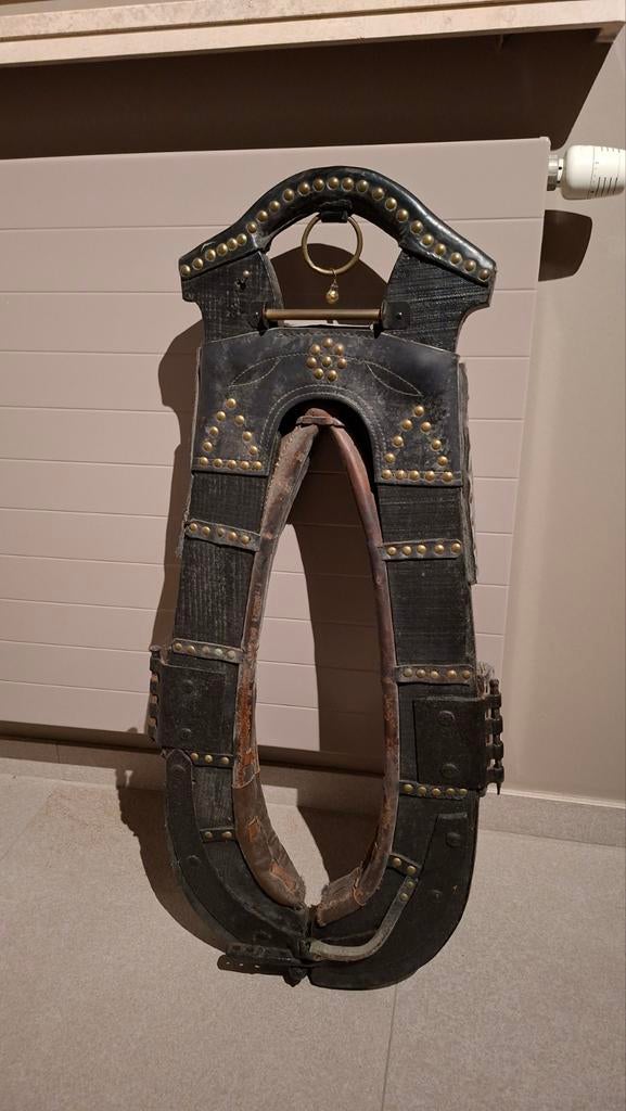 2 févr. 26MWerchter - Ancien harnais de cheval très décoratif vintageMagnifique harnais de cheval ancien, en très bon état, bel exemplaire, forme spéciale, largeur totale extérieure : 55 cm, hauteur totale extérieure : 75 cm, très lourd, uniquement enlèvement possibleEnlèvement