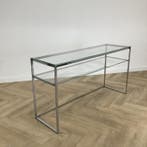 Aujourd'huiPub au topKSB KantoormeubelenToute la Belgique - Renato Zevi - Wandtafel - Metaal, Glas - console-tafelConsoletafel uit de jaren zeventig van brons en chroom, ontworpen door renato zevi, gemaakt in italië.tijdloos en elegant glam-stuk uit de jaren zeventig.goede staat met een nieuw helder glazen blad.i