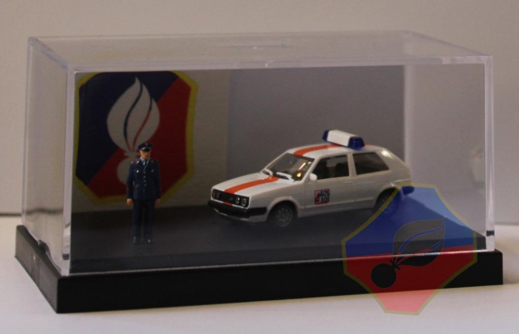 - GENDARMERIE VW GOLF GTi + PLEXI + FIGURINE 1/87Vitrine de gendarmerie vw golf gti + présentoir en plexi + figurine 1/87Envoi