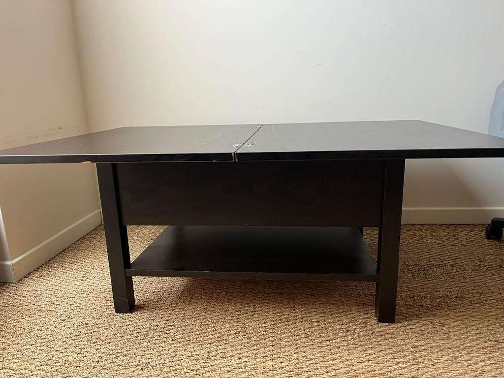 - Table basse en deux tailles avec compartiment pour stockageTable basse ikea en bois laqué en deux tailles: ouverte est fait 117 x 87 cm pliée en deux elle fait 78 x 58 cm elle a un compartiment pour stockage et étagère en dessous.Utilisé Enlèvement