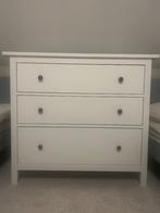 Commode hemnes met drie lades. Lades in goede staat maar aan het bovenblad is er lichte beschadiging. Aan de zijkant hangen er haakjes en de originele handvaten zijn vervangen door houten handvaten.