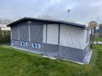 Caravan met wintervoortent, deze tent kan dus blijven staan in de winter, met daarin keuken met gasfornuis, microgolf, koelkast, enz. Kunststof tafel en stoelen, potten en pannen, waterkoker, servies