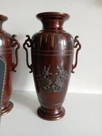 - Een paar vazen versierd met shishi - JapanEen paar bronzen vazen uit japan uit de meiji-periode, beide ongeveer 27 cm hoog, niet gesigneerd, in goede staat, met centraal reliëf van twee shishi tegenover elkaar en overeenkomstige decoratie op