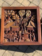 5 avr. 26GrandOrientHuldenberg - Salontafel (2) - hard hout, Polychroom hout, HoutPaartafelset van twee uit indonesië (bali of java), met hoog-reliëf tropische landelijke taferelen, vermoedelijk daterend uit het midden tot eind van de 20e eeuw, met vier rijkelijk gebeeldhouwde pote