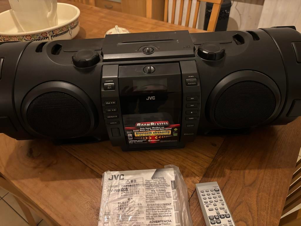 - Jvc boomblasterTe koop fijn speeltje van jvc boomblaster nog in zeer goede werkende staat kan getest worden. Radio. Cd. Usb. En je kan er je iphone nog in steken voor muziek, extra sound mode en regelbare bass prijsEnlèvement